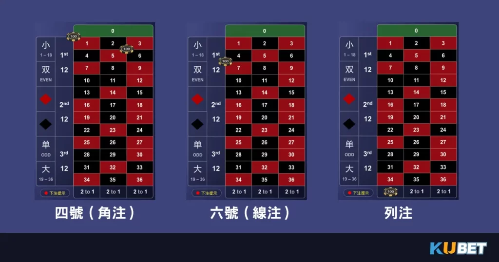 6.列注- 投注於有[2 to 1] 字樣格內,共有三個,不包括0(如1,4,7,10,13,16,19,22,25,28,31,34)。
