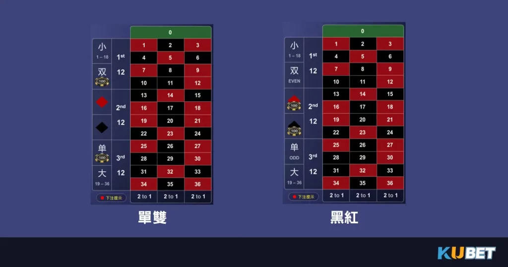 2.雙號(分注) – 可以投注於兩個號碼之間的格線上(如1,2或是3,6)。