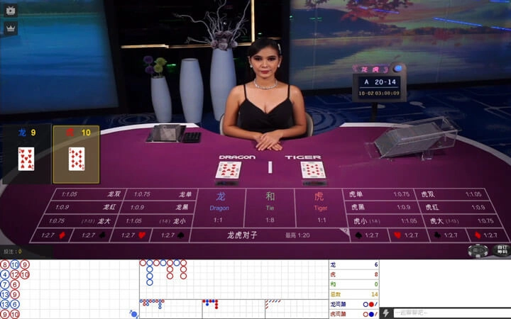 龍虎遊戲非常簡單,每局荷官只派兩門牌,兩邊各派一張牌比大,最大為K;最小為A,玩家可自由投注「龍」、「虎」、「和」、「龍黑」、「龍紅」、「虎黑」、「虎紅」、「龍虎對子」、「龍虎大小」、「龍虎單雙」、「龍虎花色」等多樣選擇。※ 當局若開「和」則押注「龍」、「虎」者各輸一半。
